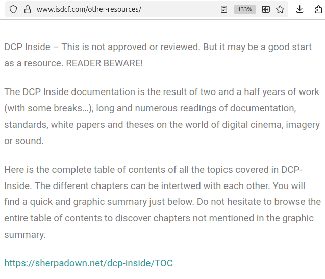 During my career at Eclair Laboratory, then Ymagis, and Doremi (and finally back to Ymagis/Eclair), I have never seen any kind of documentation about the DCP, the cryptography used, the colorimetry applied for images, comprehensive instructions about Dolby Atmos container, or anything else about the DCP format.