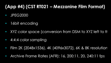 On y retrouve une des applications possibles de l'IMF nommée "Cinema Mezzanine" permettant d'avoir des images 16bits (DCP=12) allant jusqu'à 8K ! (son application/utilisation est pour de la préservation cinématographique par exemple). Et bien entendu, une version pour l'ACES 😃