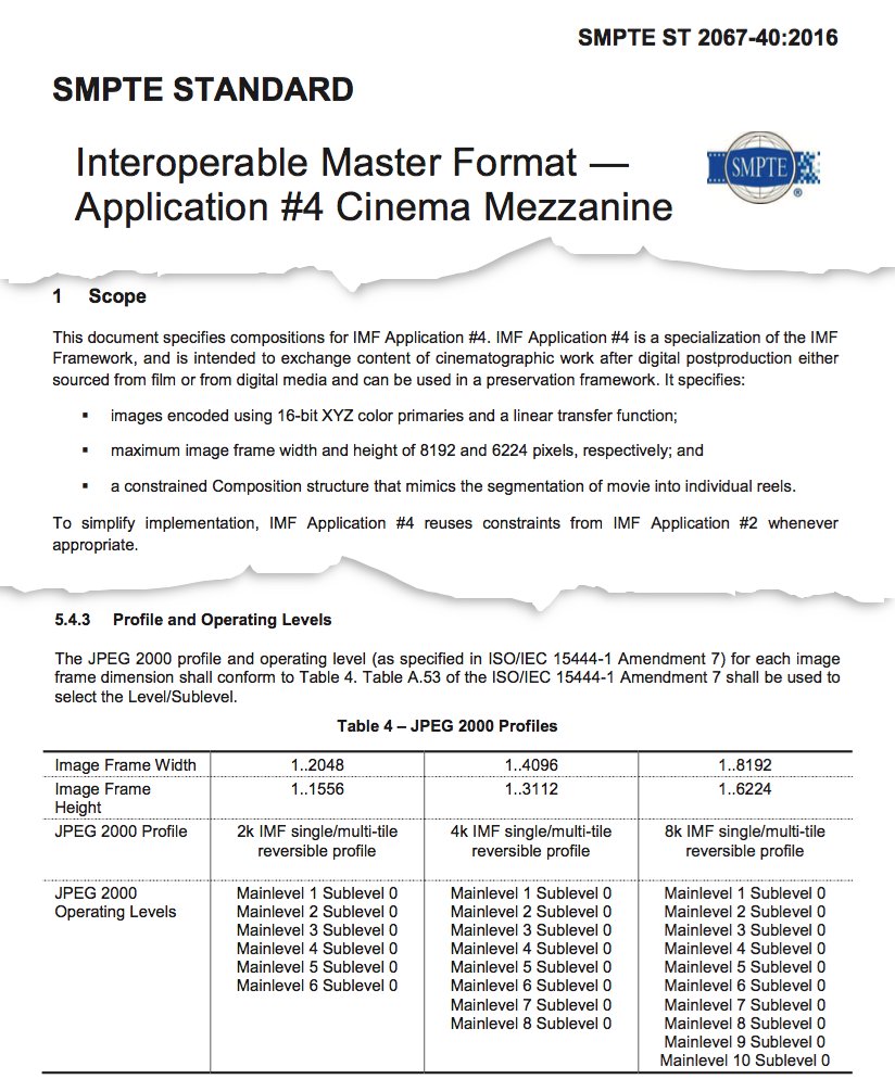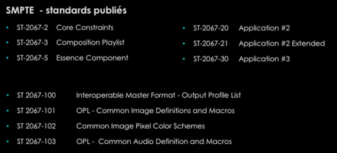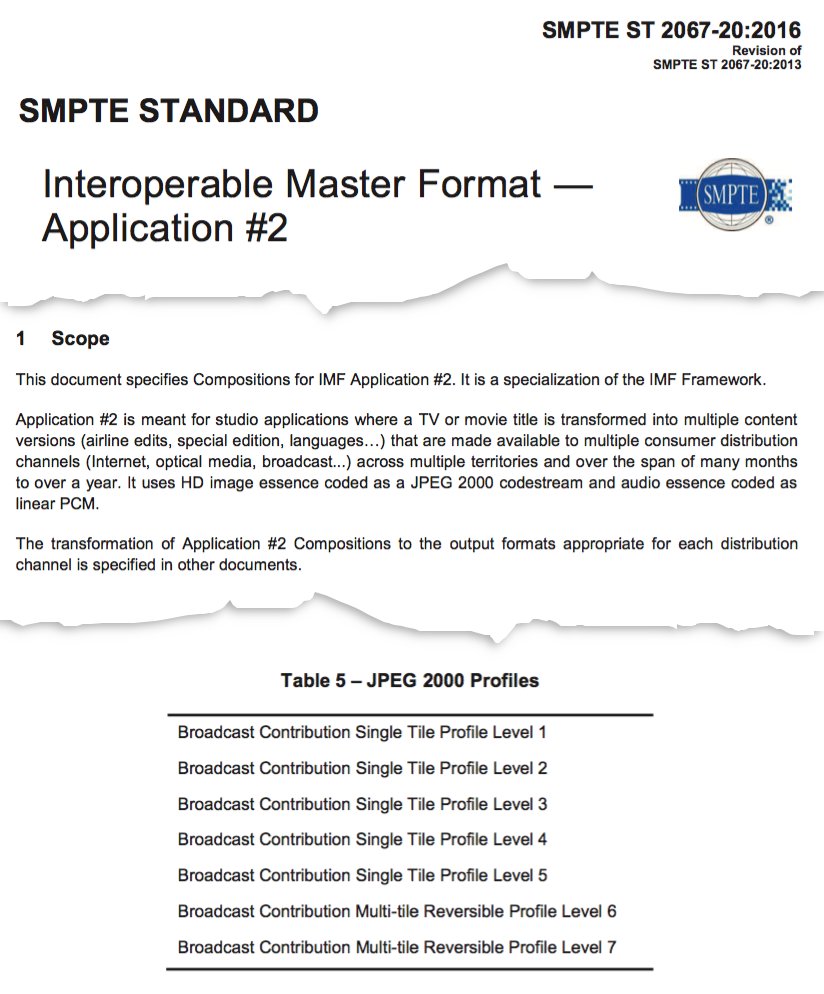 Suite des docs sur l'IMF, j'ai lu SMPTE 2067-20 à 2067-50 qui évoque les "applications" possibles, ex formats d'image acceptés dans l'IMF. Sans être étonnant, nous avons donc du JPEG2000 et MPEG4. Chaque "Application" IMF correspond à une utilisation: Télévision, Cinéma, Archives