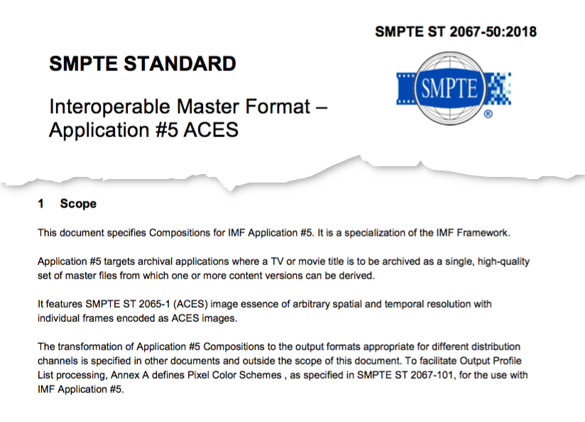 SMPTE-2065-4.2013 est intéressant, c'est la description du format de fichier ACES Image Container. Il reprend les bases du format OpenEXR développé par Industrial Light & Magic (ILM) et complété par Disney, Sony Pictures, Pixar, DreamWorks, etc. et intègre ces ajouts spécifiques.
