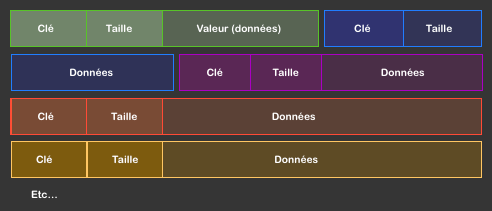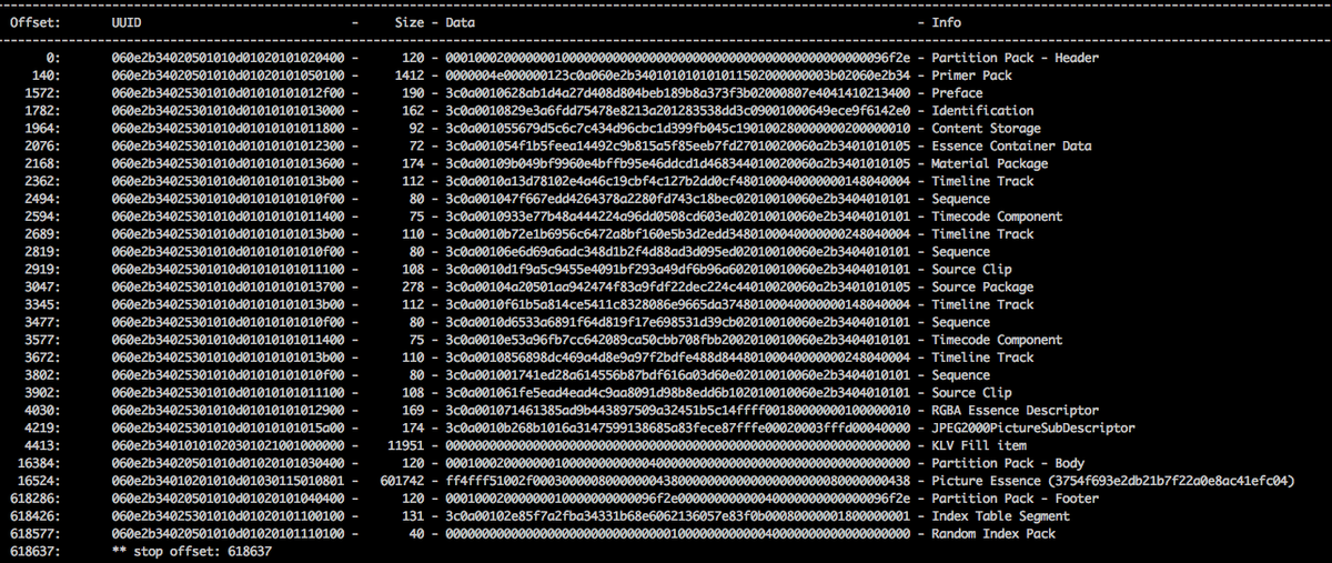 Les clefs (16b) débutent toujours par "060e2b34". Les valeurs (les données) sont soient des données structurés (pour avoir des metadatas, soit le contenu brut). Par exemple, pour une image d'un film, le JPEG2000 (non chiffré) est directement placé dans la partie Value.