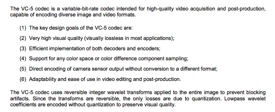 Dans le SMPTE Journal Jan/Feb 2015, un long article technique est consacré au format VC5. Cela donne une image de 5% à 15% plus grosse qu'un JPEG2000 dû au fait que le VC5 est plus rapide en compression / décompression (+ le support du 24 bits bit-depth par couleur).