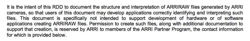 J'ai été étonné de voir en préambule qu'on peut écrire des logiciels pour interpréter/analyser des rushes ARRI, mais que pour pouvoir en créer, il faut être membre du programme Partner ARRI. A priori, c'est pour éviter de pourrir le format avec des logiciels mal codés.