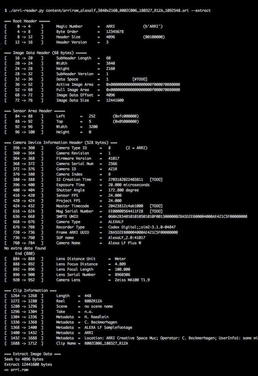 La structure d'un rush ARRI est assez simple: une série de fichier .ari contenant des données, dont les images. L'entête (header) est de 4096 bits fixe, après, ce sont les données récoltées par le capteur de la caméra (bayer toussa)