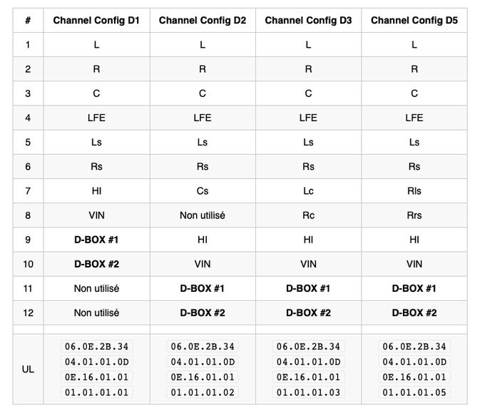Après, suivant la configuration audio dans le MXF audio, les canaux DBOX peuvent se trouver soit dans les canaux 9-10, soit les canaux 11-12 (exception, la configuration 4 étant dynamique)