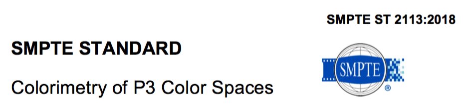On poursuit avec le SMPTE 2113 : "Colorimetry of P3 Color Spaces" - en gros, l'espace colorimétrique utilisée en projection cinéma. Il y a plusieurs "profiles" de P3 : P3D60, P3D65 et le fameux P3DCI (Digital Cinema). Chaque sont assez proches, leurs différences sont sur le blanc.