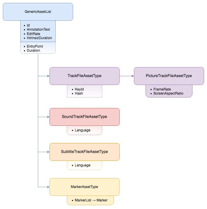Si je devais retenir un truc: Chaque AssetType (Picture, Sound, Subtitle, Marker) est dépendant d'un autre (GenericAssetList), j'ai fait un petit résumé en image avec les valeurs et options. Le sous-type récupère tous les attributs de son parent (cf. Id, EditRate, ...)