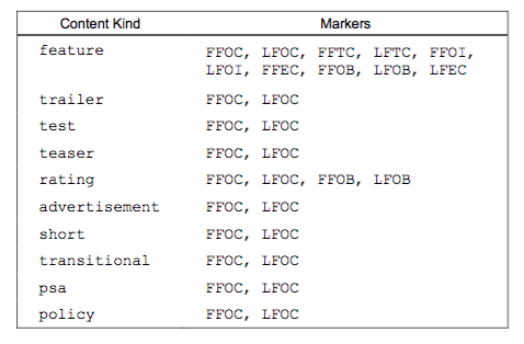 Niveau "Marker", ce sont des marqueurs permettant d'identifier certains moments clefs du film (tableau 1) et tributaire du type du film (tableau 2). Et le petit détail marrant: une bobine ne peut pas être de moins d'une seconde. Fin du SMPTE 429-7 (CPL)