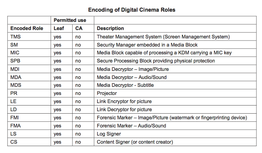 SMPTE 430 : Les certificats numériques utilisés par les lecteurs films numériques (DCP). Ces certs servent à authentifier le matériel & chiffrer les clefs pour les KDMs. Vous avez deux clefs: une publique (donné au laboratoire) et une privée, qui ne sort jamais (normalement ;)
