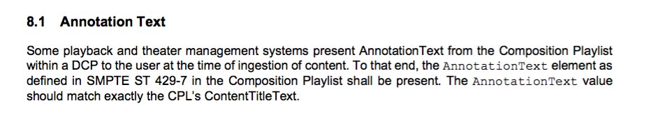 L'AnnotationText dans la CPL qui sera présenté aux différentes intervenants de la chaîne de distribution du film était avant optionnel (DCP SMPTE v1), maintenant il est devenu obligatoire et en plus il doit être égal au ContentTitleText. On se demande alors pourquoi ce doublon