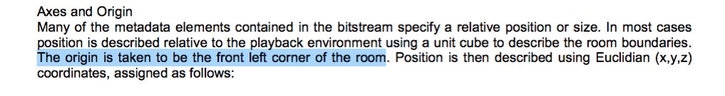SMPTE Dolby Atmos: Le système de positionnement de chaque canal Dolby Atmos est défini avec des coordonnées Euclidiennes dans une plage de 0 à 1. Le son [0, 0, 0] est en avant de la salle, à gauche en bas. [1, 1, 1]: Arrière de la salle de projection, côté droit et en haut.