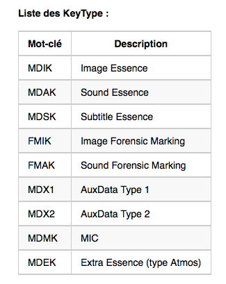 Cette partie est chiffrée avec l'algorithme RSA-2048+OAEP, le tout englobée dans du base64. Chaque clef est identifiée par un type (MDIK, MDAK, ..) que vous retrouverez dans les CPL et les KDM (en 15 ans, jamais compris l'utilité, hormis identifier le type ... qu'on connait déjà)