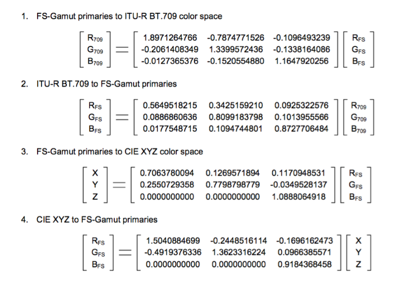 Dans le SMPTE-2048-1 "Digital Cinematography Production Image Formats FS/709", on y retrouve pas mal d'information sur les systèmes colorimétriques, les FS-Log/Gamut et notamment les règles de conversions BT709 RGB vers XYZ