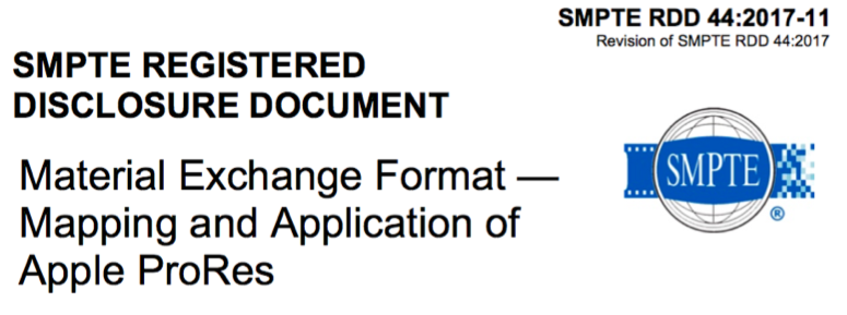 SMPTE RDD-44-2017: La définition (rapide) de l'Apple ProRes. Format pas mal utilisé dans les laboratoires de postprod depuis 10-15 ans. Les seuls éléments que je retiens de ce SMPTE est le tableau de correspondance des différents débits, ...