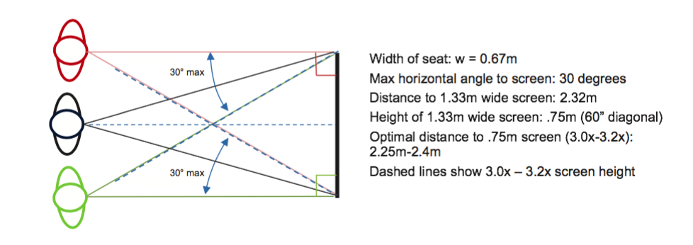 La SMPTE 2080-3 donne les références d'un environnement de visualisation idéal pour l'evaluation des images HDTV. Il préconise d'attendre 10 min pour que l'oeil s'adapte correctement, ne pas dépasser certains angles et la distance idéal soit de 3 à 3.2 fois la hauteur de l'image.