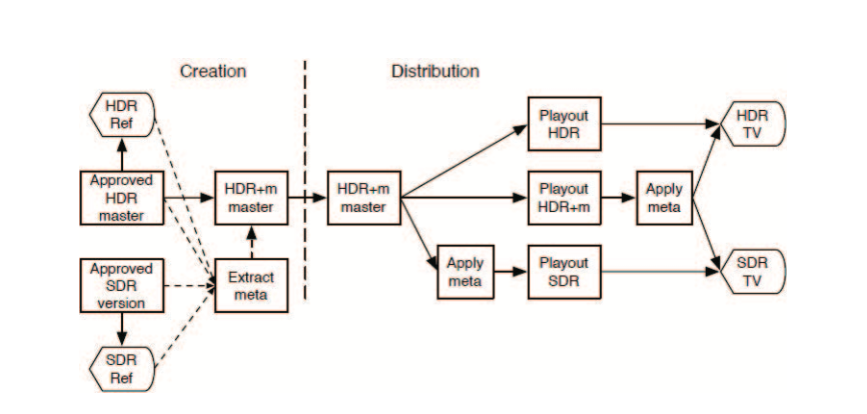 Et voici le workflow d'un contenu HDR / SDR. En gros [très gros], on fait des validations HDR et SDR du film, puis on fait un master HDR, on lui colle les métadatas HDR & SDR et en distribution, on lit le contenu HDR et on applique les metadatas correspondant à la sortie visuelle