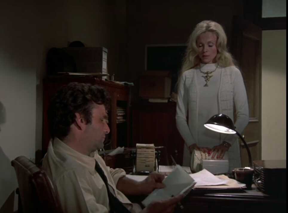 - Dans cette épisode, la coupable annonce clairement le jeu de columbo : raconter des petites histoires sur femme, faire sembler d’oublier, etc… Columbo a un léger rictus.