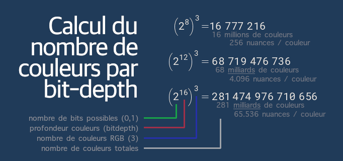 Pour ceux voulant calculer rapidement le nombre de couleurs au total par rapport rapport au bit-depth, je vous ai fait un petit résumé en image rapidos