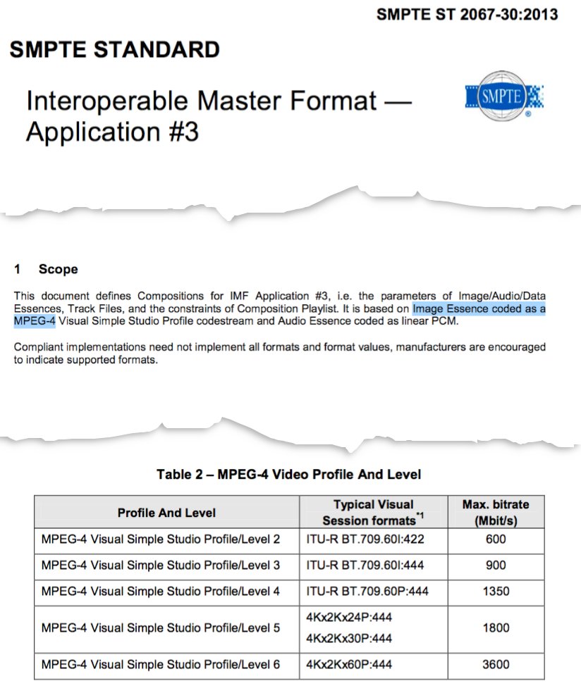 Je me demandais s'il y avait une spécification "App" IMF avec des images non compressées. Effectivement, c'est l'App #1 - probablement défini dans les docs SMPTE ST-2067-1 à 19 [Core]: MXF avec du DPX non compressés. (ils me manquent certains SMPTE-2067 dans ma collection)