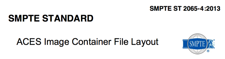 SMPTE-2065-4.2013 est intéressant, c'est la description du format de fichier ACES Image Container. Il reprend les bases du format OpenEXR développé par Industrial Light & Magic (ILM) et complété par Disney, Sony Pictures, Pixar, DreamWorks, etc. et intègre ces ajouts spécifiques.