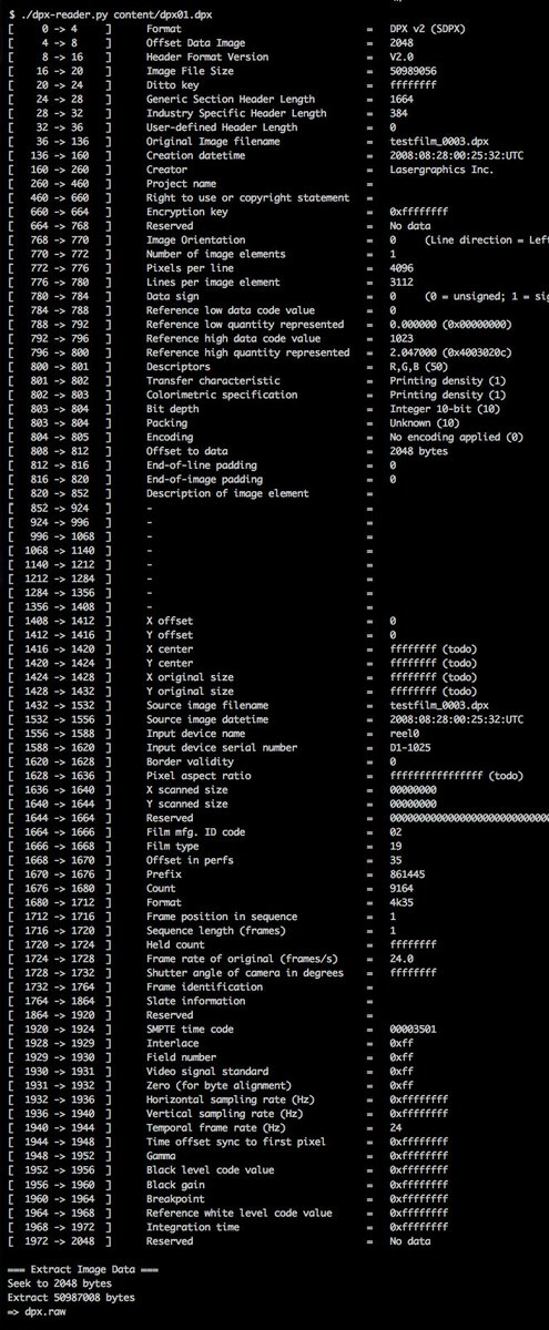 *qu'on puisse écrire (... à quand l'edit sur twitter...) Pour compléter ce SMPTE: les données dans les en-têtes sont à positions fixes. La position des données image est variable, mais assez fréquemment, elles se trouvent soit à des offsets classiques (2048, 4096, 8192). J'en ai profité pour écrire un prog (proto) pour gérer les DPX :