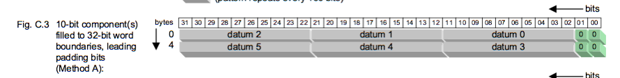 Bon à savoir, quand on lit chaque composant RGB en 10-bits, on lit le rouge sur 10-bits, le vert sur 10-bits et le bleu sur 10-bit, puis on lit 2 bits pour le padding pour faire un joli 32-bits tout "rond"