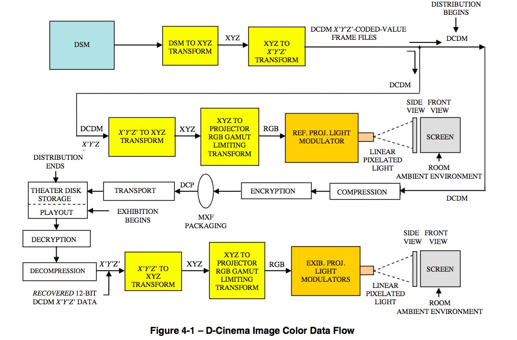 Dans le SMPTE EG-432-1-2010 "Digital Source Processing - Color Processing D-Cinema", on y retrouve le workflow complet du labo postprod à la salle de projection