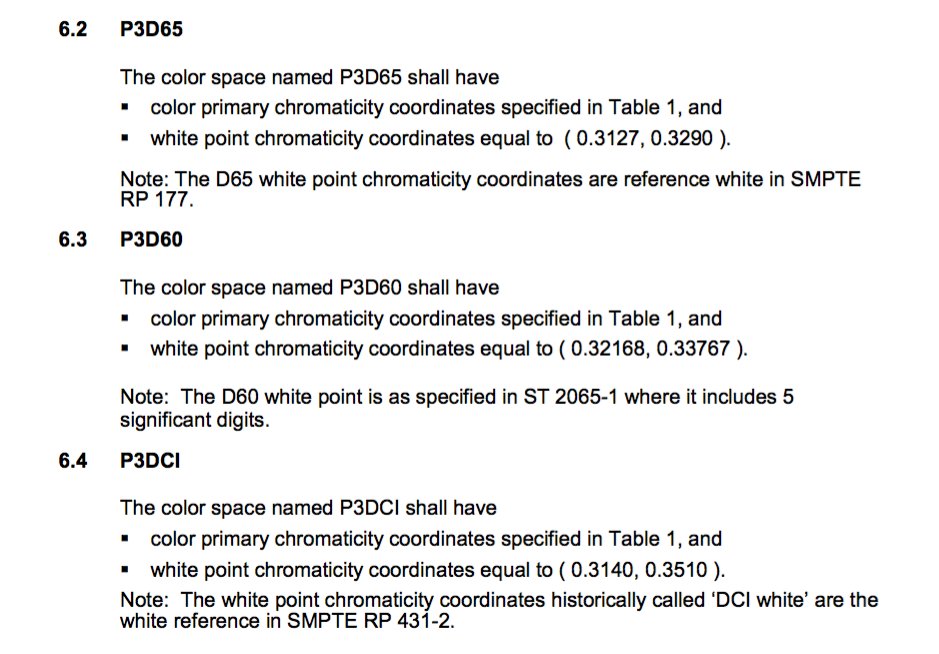 On poursuit avec le SMPTE 2113 : "Colorimetry of P3 Color Spaces" - en gros, l'espace colorimétrique utilisée en projection cinéma. Il y a plusieurs "profiles" de P3 : P3D60, P3D65 et le fameux P3DCI (Digital Cinema). Chaque sont assez proches, leurs différences sont sur le blanc.