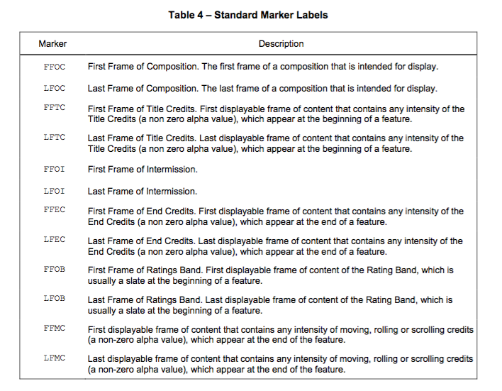 Niveau "Marker", ce sont des marqueurs permettant d'identifier certains moments clefs du film (tableau 1) et tributaire du type du film (tableau 2). Et le petit détail marrant: une bobine ne peut pas être de moins d'une seconde. Fin du SMPTE 429-7 (CPL)