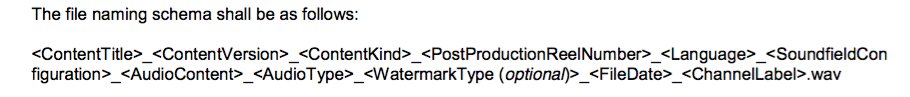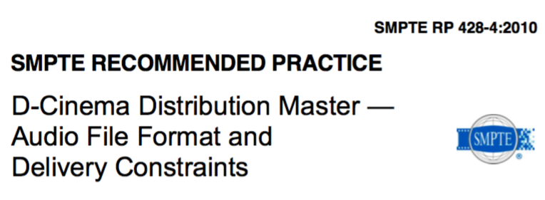 Suite avec SMPTE RP-428-4:2010 sur le D-Cinema Distribution Master - Audio File Format and Delivery Constraints, aka DCDM Audio (pour les connaisseurs). On voit que les pistes audio sont extrêmement normalisées pour leur version master que ce soit au niveau contenu comme nommage.