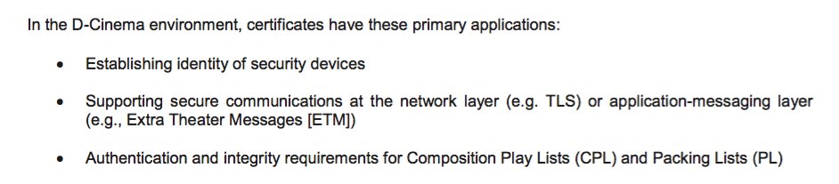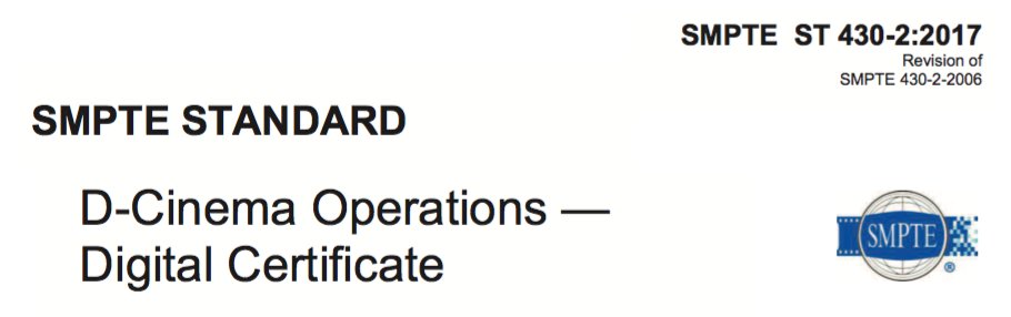 SMPTE 430 : Les certificats numériques utilisés par les lecteurs films numériques (DCP). Ces certs servent à authentifier le matériel & chiffrer les clefs pour les KDMs. Vous avez deux clefs: une publique (donné au laboratoire) et une privée, qui ne sort jamais (normalement ;)
