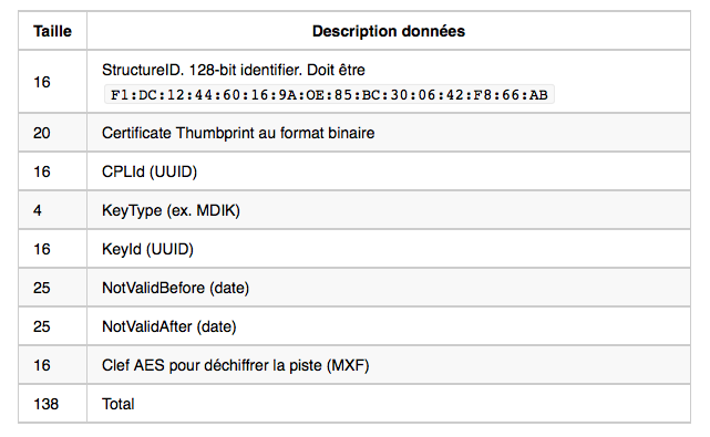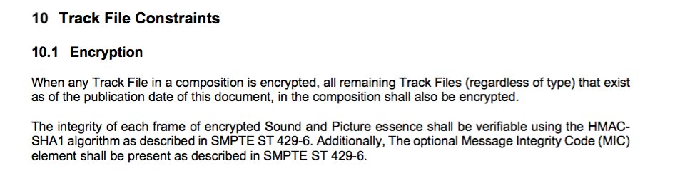 Autre nouveauté, le Hash de chaque élément du film (Picture, Sound, ...) devient maintenant obligatoire ! Et si une piste est chiffrée (encrypted), toutes les autres pistes (peu importe le type: Picture, Audio, Subtitle, AuxData) doivent être aussi chiffrées !