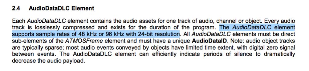 Un gros morceau, SMPTE définissant Dolby Atmos. A retenir: Actuellement, le DolbyA est soit du 48 kHz, soit du 96 kHz et en 24-bit. Que le support des frames sont 24, 25, 30, 48, 50, 60, 96, 100 et 120 images par second. Si vous voyez une séance Dolby Atmos autre, il y a un souci