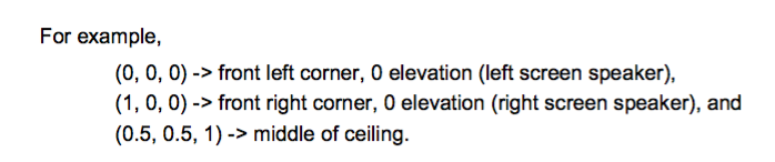 SMPTE Dolby Atmos: Le système de positionnement de chaque canal Dolby Atmos est défini avec des coordonnées Euclidiennes dans une plage de 0 à 1. Le son [0, 0, 0] est en avant de la salle, à gauche en bas. [1, 1, 1]: Arrière de la salle de projection, côté droit et en haut.