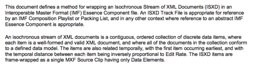 SMPTE RDD-47: IMF ISXD: Une extension pour le format IMF (futur format pour toute l'industrie cinéma/TV/préservation), pas vraiment compris à quoi cela servait... ni même si cela sera utilisé réellement...