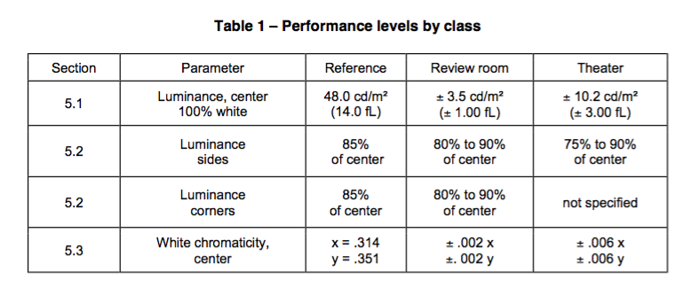 Les specs cinéma définissent que la puissance lumineuse doit être à 14 Foot Lamber (fL), soit 48.0 cd/m2 (à titre de comparaison, EclairColor est à 30 fL). La tolérance est en salle de vérification est de ±3.5 cd/m2 (± 1.00 fL), et en salle de projection ±10.2 cd/m2 (± 3.00 fL)