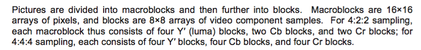 (..) la description rapide des macroblocks et des composants YCbCr (Y pour la luminance, Cb: bleu et Cr: rouge, le vert étant calculé), et que tous les blocs de macroblocks ne sont pas égaux, les derniers blocs sont plus petits, à cause de la subdivision imparfaite de l'image