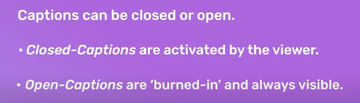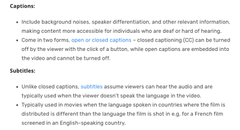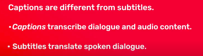 En lisant la norme SMPTE 429-12 "D-Cinema Packaging - Caption and Closed Subtitle, il est assez incompréhensible de différencier entre Captions et Subtitles. Finalement, voici les différences majeures entre les deux :